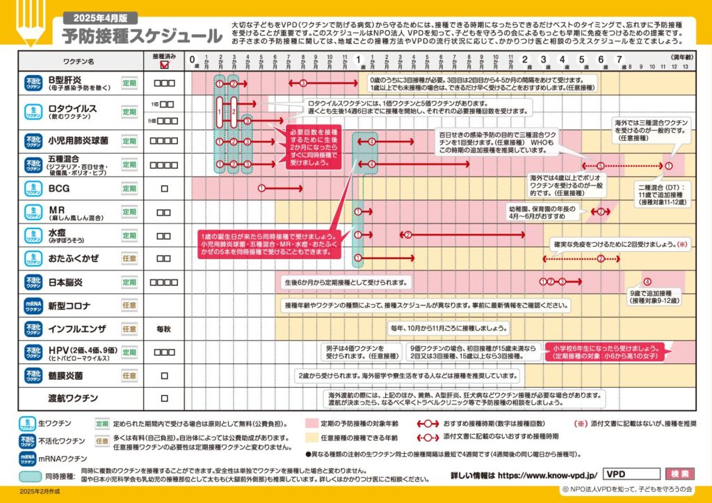 千葉県内にお住いのお子さんの定期予防接種を行っております。 任意または公費対象期間外予防接種につきましては料金表をご覧ください。 予防接種の種類、実施内容とともに、接種の推奨時期が定められています。それぞれの予防接種を実施する推奨時期は、お母さんから赤ちゃんにあげていた免疫効果の減少、感染症にかかりやすい年齢、かかった場合に重症化しやすい年齢などを考慮して設定されています。 早めに計画を立てて、接種できる月齢・年齢になれば、できるだけ早く接種を受けましょう。早くから病気を予防できるだけでなく、スケジュールにも余裕がでてきます。